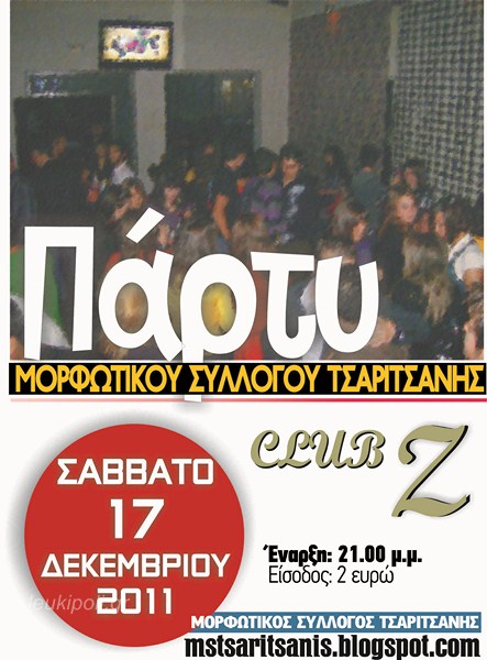 Το Σάββατο, στις 17 Δεκεμβρίου, ο Μορφωτικός Σύλλογος Τσαριτσάνης θα πραγματοποιήσει πάρτυ στο «Κλαμπ Ζ» στην κεντρική πλατεία της Τσαριτσάνης. Η έναρξη τοποθετείται στις 22.00 το βράδυ και η είσοδος θα είναι 2 ευρώ.